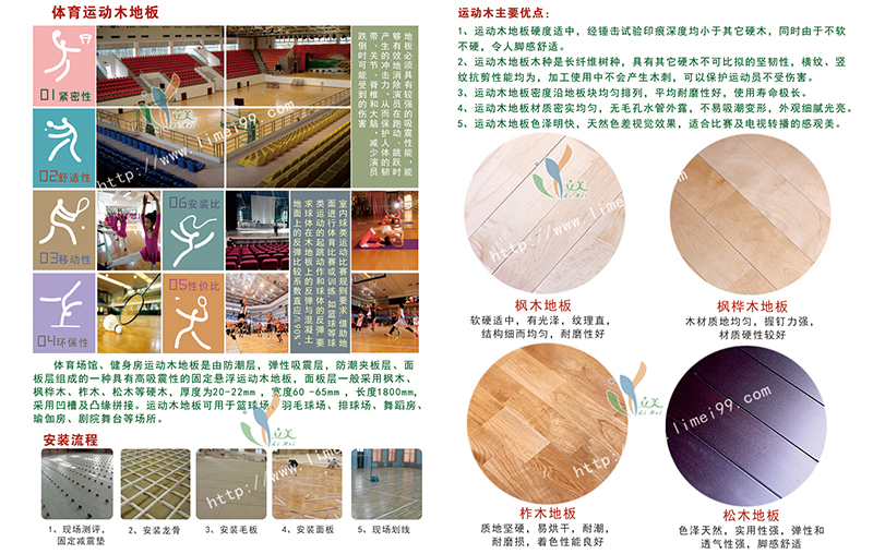 立美体育地板的主要材料是天然的实木材料,实木体育运动地板是比较传统的运动木地板,和复合运动地板有本质的区别.实木运动地板是指面板采用原木的运动地板,也就是说,即使其它部分如底层构造采用木浆甚至是钢结构,只要面板层采用枫木实木地板原木,便可认为是实木运动地板。